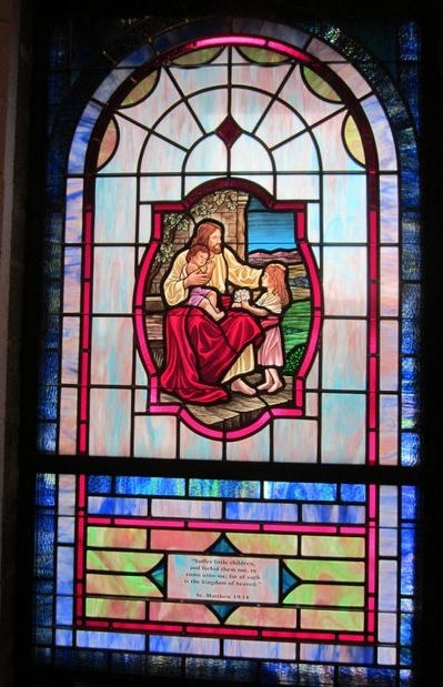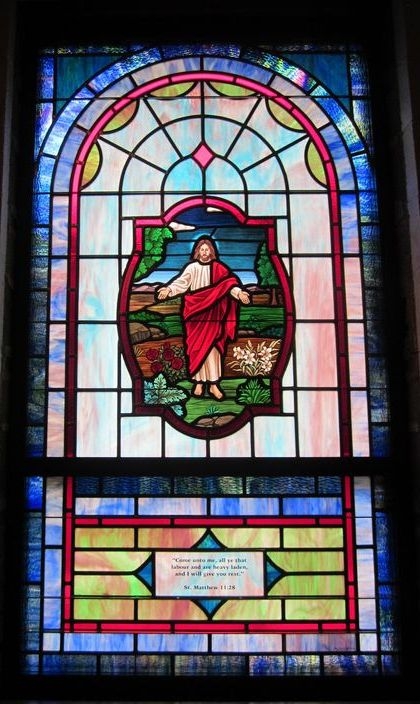 Opalescent glass window with 18" x 26" medallion of "Come Unto Me" and a memorial plate