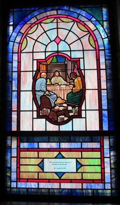Opalescent glass window with a 18" x 26" medallion of the "Supper at Emmaus" and a memorial plate