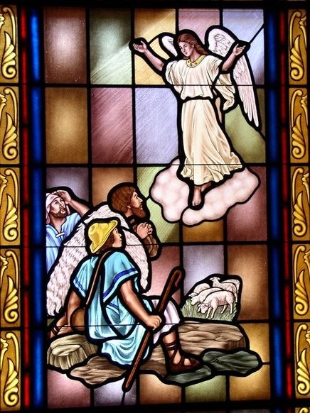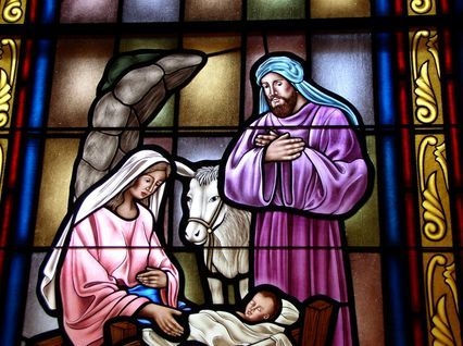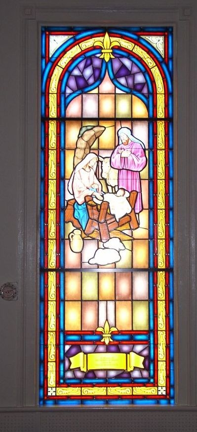 Hand-stained glass window with floating scene of "The Nativity" and scroll memorial plate