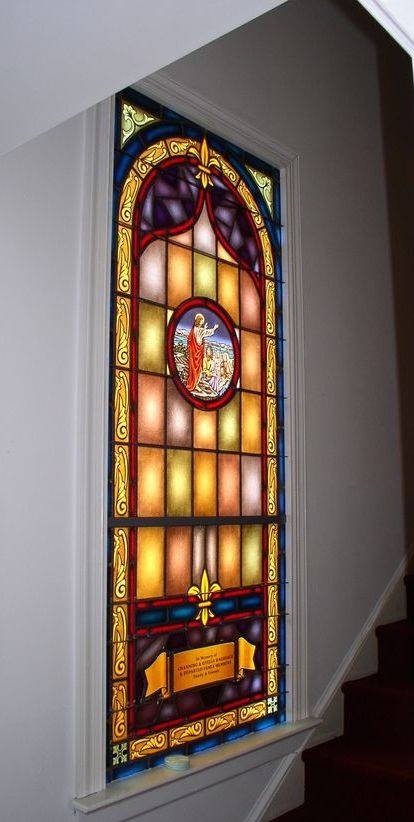 Hand-stained glass window with a floating scene and a scroll memorial plate