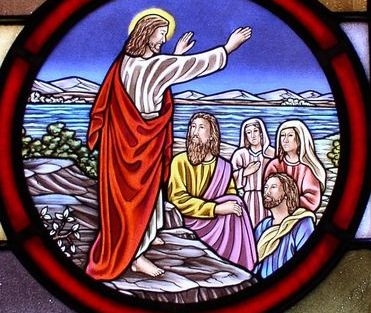 Hand-stained glass window with a 12" round Biblical scene and a scroll memorial plate