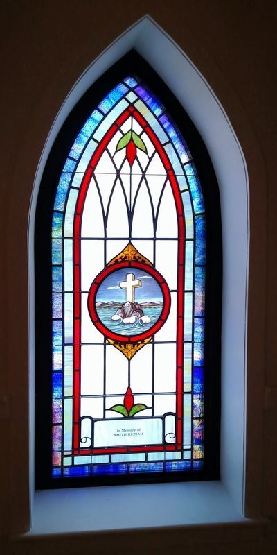 Opalescent glass window with a 12" round symbol and a memorial plate