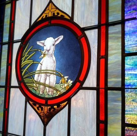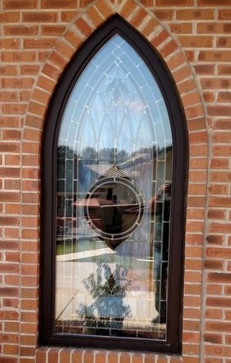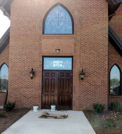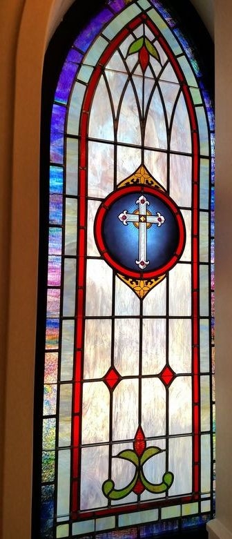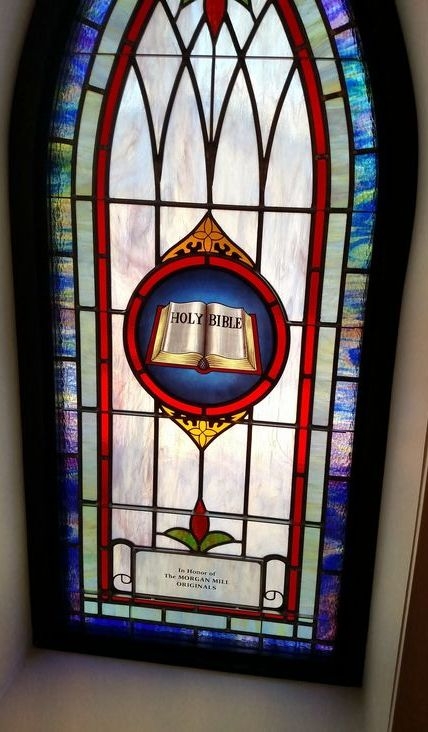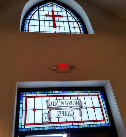 In 2016, Lee Park Baptist Church built a new sanctuary. Along with the new sanctuary, they added a new chapel called Morgan Mill Chapel in remembrance of an older church that had combined with Lee Park Baptist Church. Laws Stained Glass Studios provided (8) opalescent glass windows for this new chapel. The four side windows (size 32" wide x 72" high with a gothic top) each contained a 12" round hand-stained glass symbol and a memorial plate. The two front windows (size 32" wide x 88" high with a gothic top) each have a 12" round symbol as well, but no memorial plate. One of these windows has a custom-made "Lamb" symbol. The gothic top transom (size 76" wide x 80" high) has a red cross and the square transom ( size 76" wide x 36" high) has a ribbon with the chapel's name.