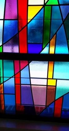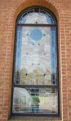 Opalescent glass windows that were resized and installed in new dark bronze aluminum frames in 1987 with safety plate glass as the protective covering