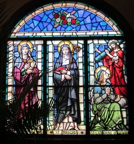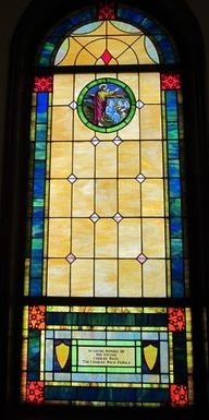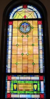 Existing pictorial hand-stained glass windows which Laws added new the new top section with the crucifix and roses