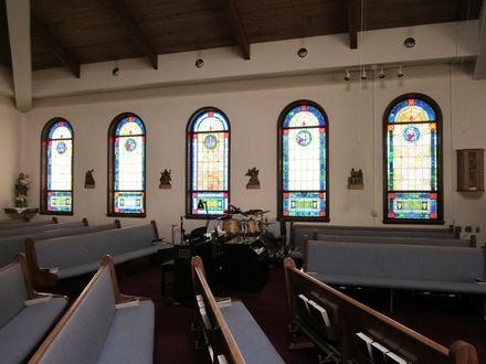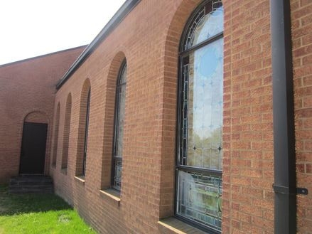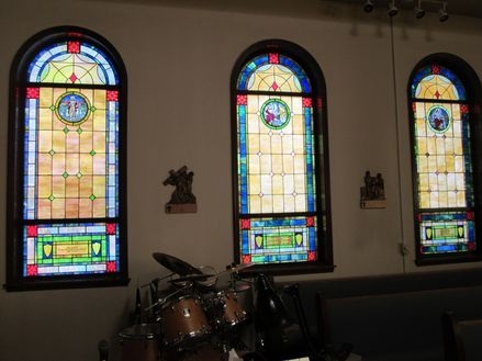 In 1987, Laws removed these windows and installed them into their new sanctuary. Laws provided new dark bronze aluminum frames for the (10) windows and (6) hand-stained pictorial windows. Above each window, Laws made new round tops. The tops over the pictorial windows including a cross and rose symbol. Laws also provided new door panels and protective covering.