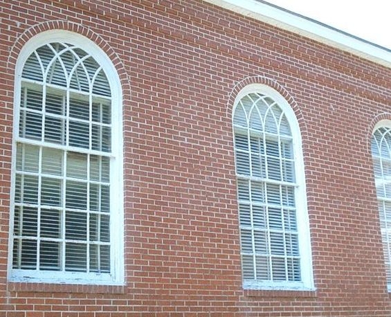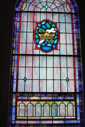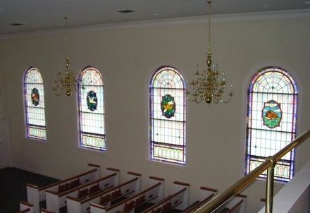 In 2008, Laws Stained Glass Studios installed 10 opalescent glass windows (size 52" wide x 114" high) with 18" x 26" medallions depicting Christian symbols at Ochlocknee Baptist Church in Ochlocknee, GA. Laws removed the existing wood sashes and installed the leaded windows into the existing wood frames. On the outside, Laws installed 1/4" Lucite as the protective covering. Each window has a 18" x 26" hand-stained symbol in a medallion, quadrafoil shape.