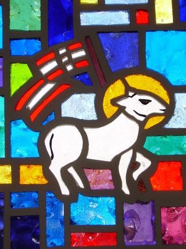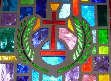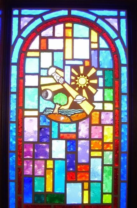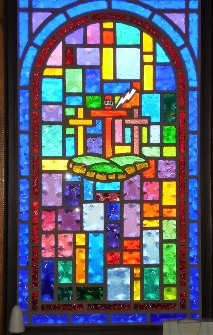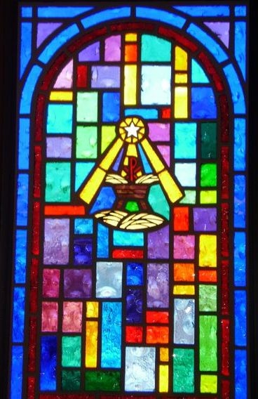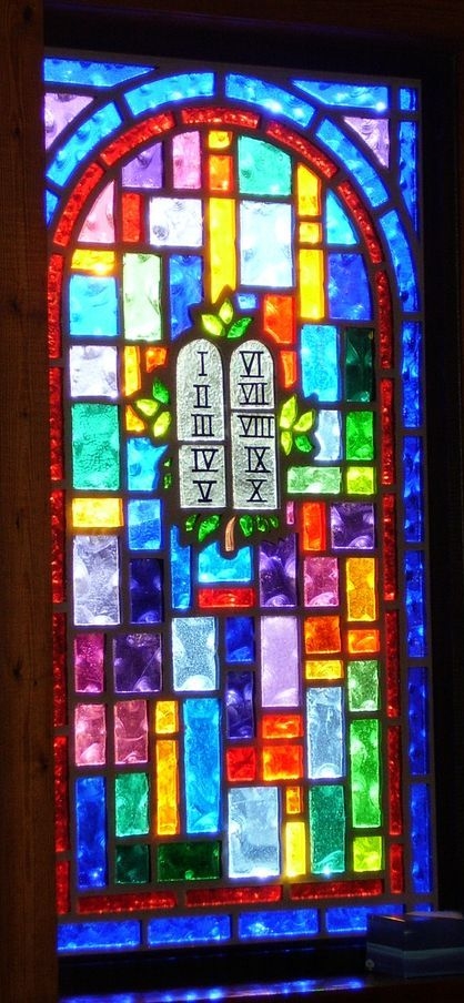 Faceted glass window with "Ten Commandments" symbol