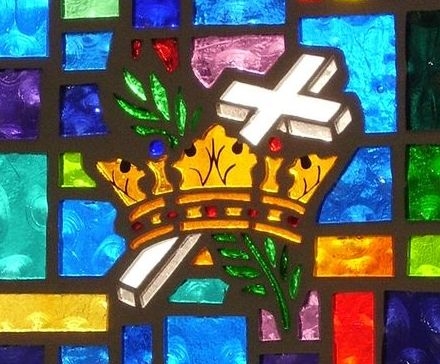 Close-up of the "Cross, Crown, & Palm Branch" symbol