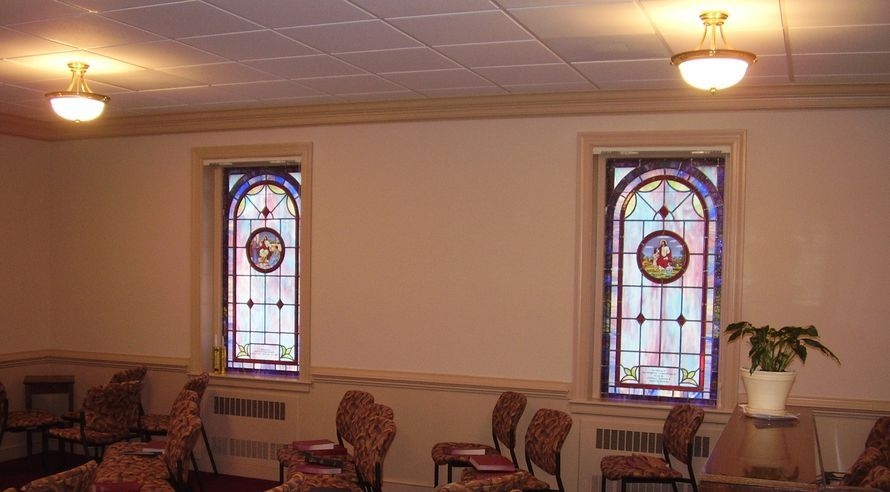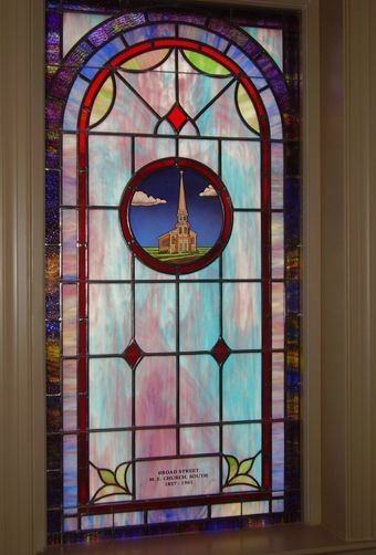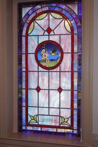 Opalescent glass windows with a 12" round Biblical scene and a memorial plate