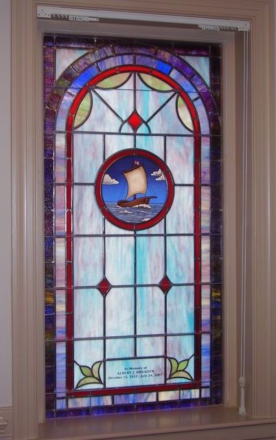 Opalescent glass window with the special "boat" scene (Traditionally, this represents the gospel being spread throughout the world.)