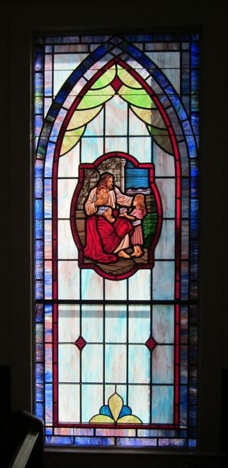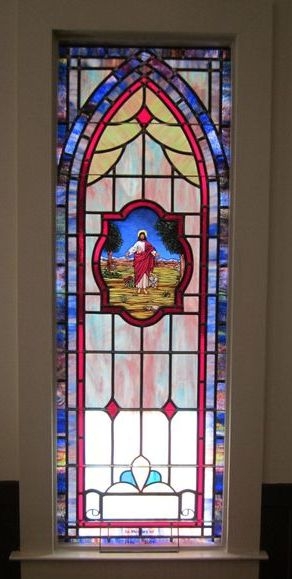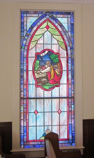 In 2012, Laws Stained Glass Studios installed (9) opalescent glass windows at Rockledge United Methodist Church in Rockledge, GA. The six main windows (size 36" wide x 92" high) each contained a 18" x 26" hand-stained glass medallion with a scene from the "Life of Christ", but no memorial plate. The two smaller windows (size 24" wide x 70" high) had a one-piece, medallion-shaped scene from the "Life of Christ" and a memorial plate. The transom (size 60" wide x 20" high) did not have artwork or a memorial plate.