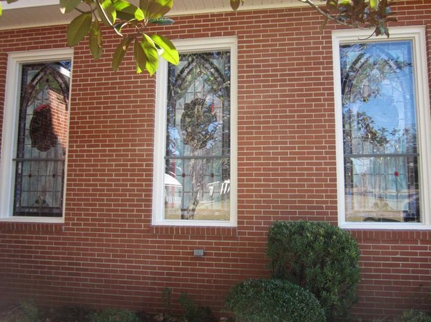 The church had wood sash windows with clear glass on the inside, and on the outside, they had installed Krinkle glass (a thin, somewhat transparent fiberglass). Laws began the installation by removing the existing wood sashes and installing the new leaded window into the existing wood frame. The outside wood perimeter of the frame was covered with white aluminum flashing. On the outside and on top of the new flashing, Laws installed 1/4" Lucite as the protective covering.