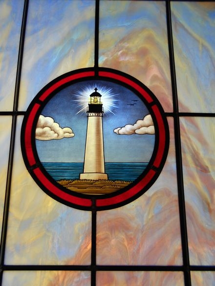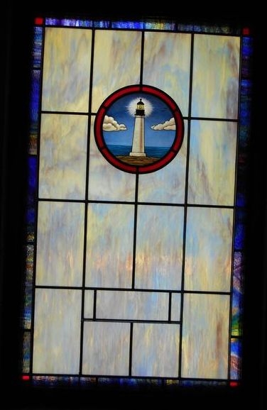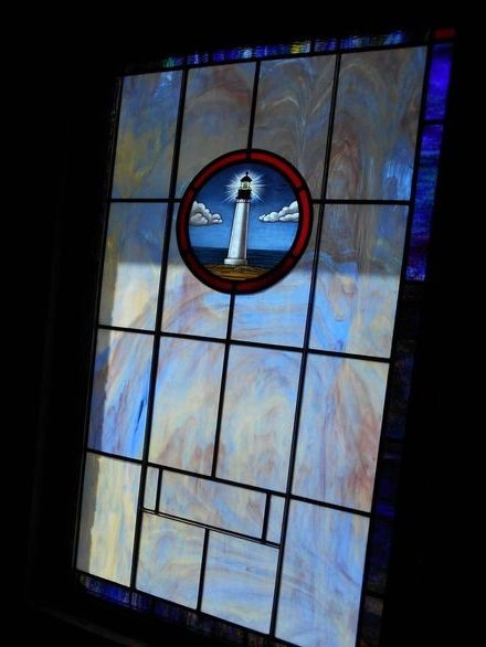 In 2016, Laws Stained Glass Studios installed (13) opalescent glass windows at the Lighthouse Deliverance Church in Statesville, NC. All of the windows are opalescent and leaded. The thirteen windows (size 40" wide x 64" high) each contained a 12" round symbol and a memorial plate. Laws produced a custom hand-stained glass symbol of a lighthouse for the church. This symbol was placed in all the windows.