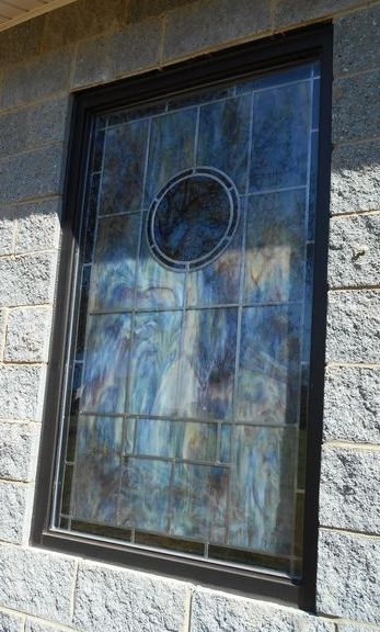 Opalescent glass window with a 12" round symbol set into a dark bronze aluminum frame