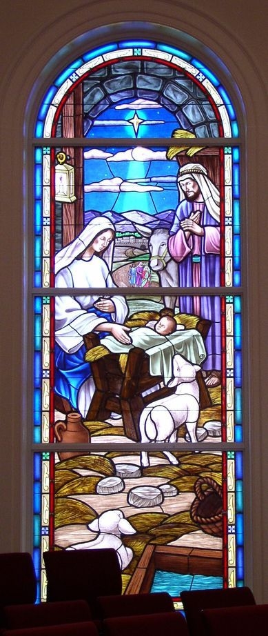 Hand-stained glass window with the scene of "The Nativity"