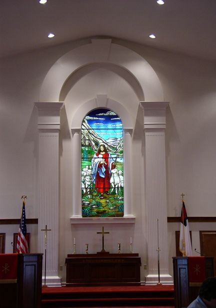 "The Good Shepherd" window behind the pulpit. It is lit by a light box.