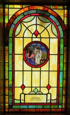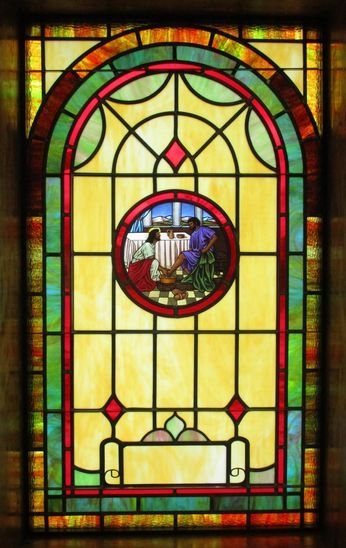 Opalescent glass windows with a 12" round Biblical scene and memorial plate at the bottom