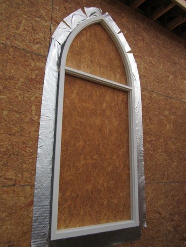 In June 2012, Laws comes and installs the aluminum frames into the stud opening. OSB board is placed in the openings to keep the weather out. On the outside the frames are covered by polyethelene plastic while the brick is being layed.