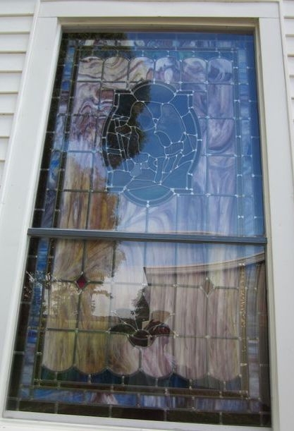 Close-up from the outside of the opalescent glass window set into the existing wood frame with 1/4" Lucite acrylic as the protective covering