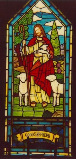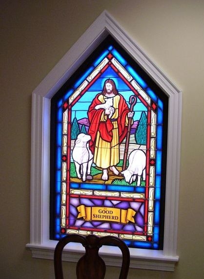 Hand-stained pictorial glass window of the "Good Shepherd" in a classroom