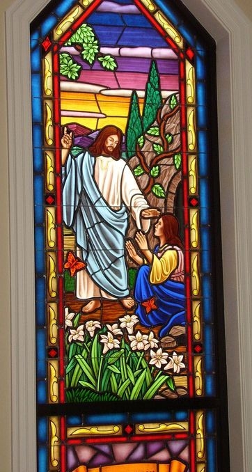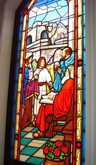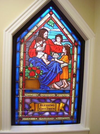 Hand-stained pictorial glass window of the "Blessing the Children" in a classroom