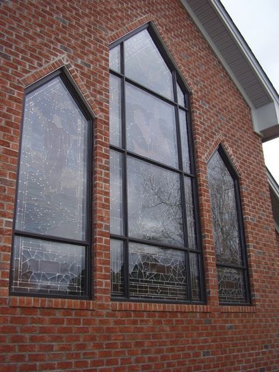 Hand-stained glass windows set into dark bronze aluminum frames with 1/4" Lucite SAR acrylic on the outside as protective covering