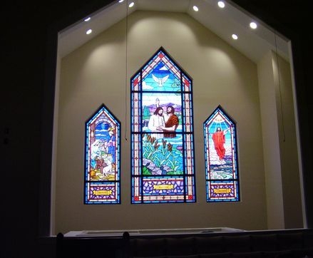 Hand-stained pictorial glass windows behind the pulpit