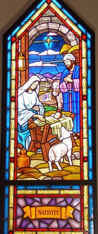 Hand-stained pictorial glass window of the "Nativity" set into a dark bronze aluminum frame