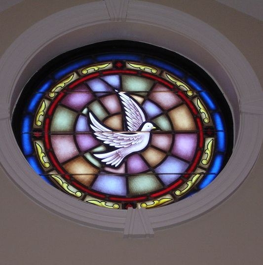 Hand-stained glass window with a floating dove set into a dark bronze aluminum frame