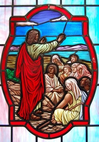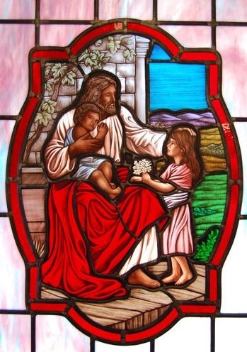 At the top is a hand-stained pictorial glass window depicting "Come Unto Me". At the bottom are opalescent glass windows.