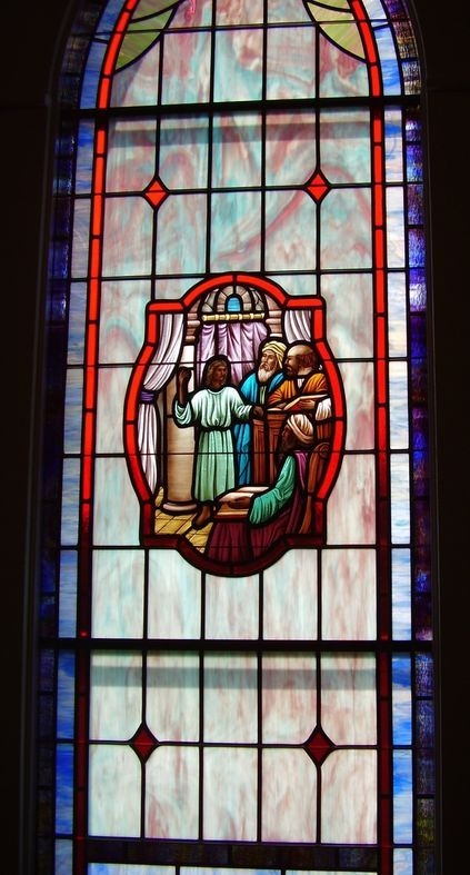 Close-up of opalescent glass window with a 18" x 26" medallion with a Biblical scene