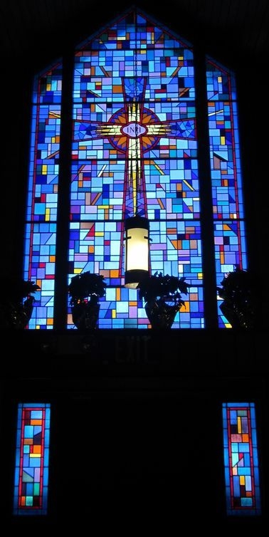 6ft. round cathedral glass window behind the pulpit