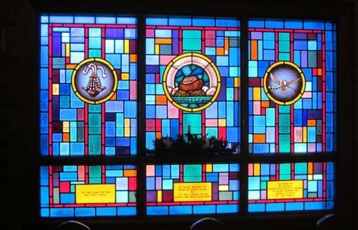 Cathedral glass window (a triple window); The center section has an 18" round cut & leaded symbol and the sides have 12" round symbols. At the bottom of each section is a memorial plate in an amber color.