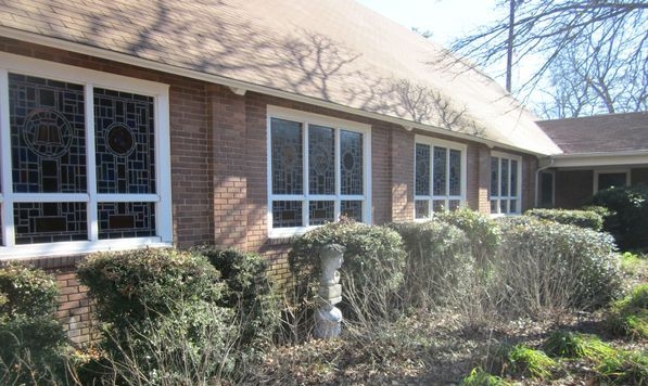View of the cathedral glass windows from the outside with no protective covering