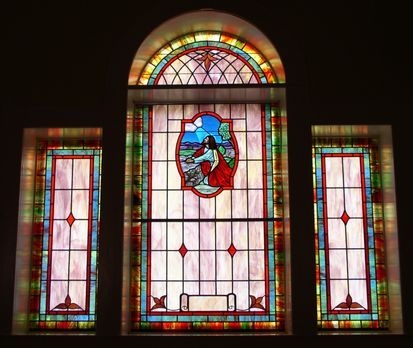 Opalescent glass windows with a 18" x 26" Biblical scene medallion in the center windows