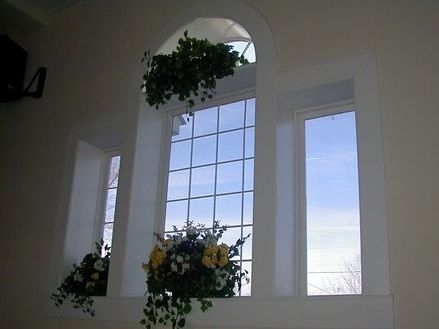 In 2002, Laws Stained Glass Studios installed (12) opalescent glass windows at New Hope Apostolic Church in Danville, VA. The windows were composed of groupings of three with the larger window in the center. The four large windows (size 48" wide x 100" high with a round top) contained a 18" x 26" hand-stained glass medallion and a scroll memorial plate. The eight smaller windows (size 24" wide x 61" high) that were on either side of the large window did not contain artwork