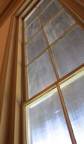 Faceted glass windows set into the existing wood frames