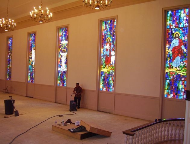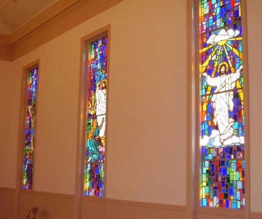 In 2011, Laws Stained Glass Studios installed 10 faceted glass windows at Pine Forest United Methodist Church in Dublin, GA. These ten sanctuary windows (size 41" wide x 164" high) each contained a floating scene from the life of Christ: the Nativity, the Baptism, Boy in the Temple, the Sermon on the Mount, Come Unto Me, Crucifixion, the Ascension, Blessing the Children, the Resurrection, and the Good Shepherd. Laws removed the existing wood sashes and installed the faceted glass windows into the existing wood frames.
