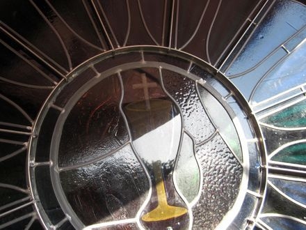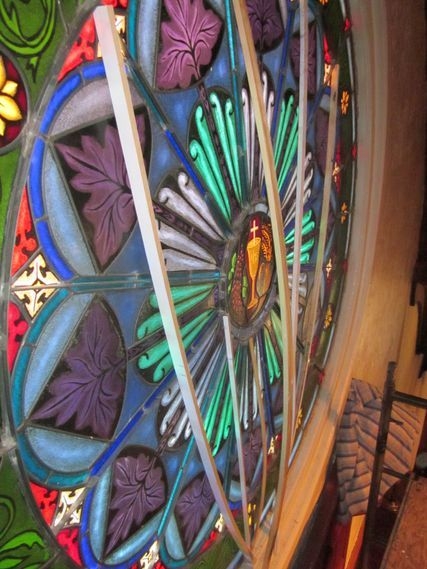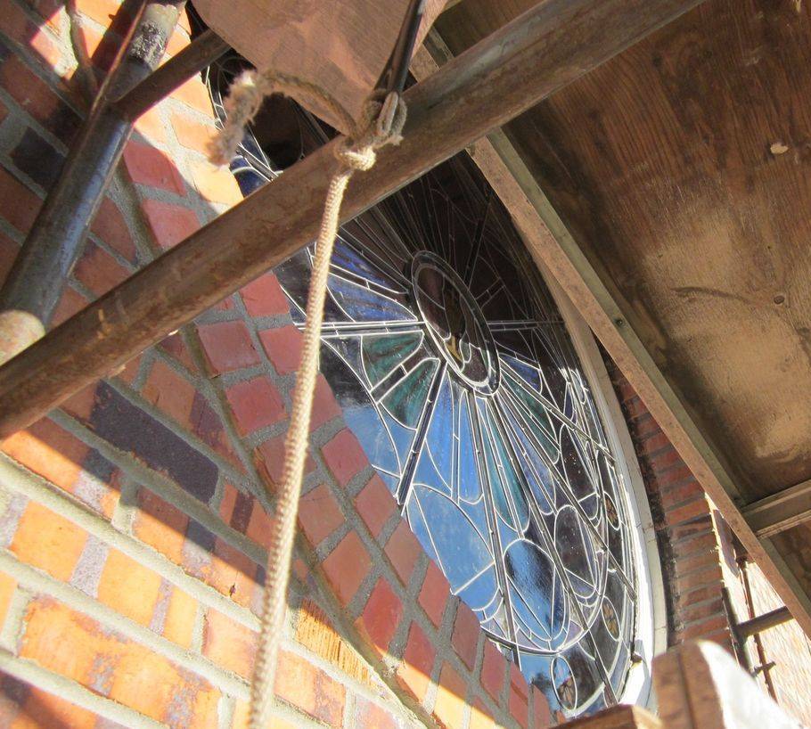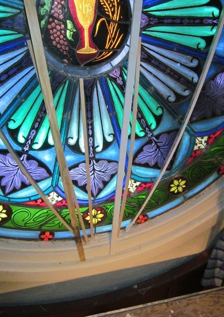 Laws Stained Studios came and straightened the bulge and prevented it from sagging. Laws' road crew straightened the window in place and added interlocking steel braces to the inside and outside of the window. The interlocking braces formed a spider web like pattern with a 12" round brace and a 64" round brace and the other braces radiating out in straight lines. These additional braces gave the leaded window enough support to remain straight.