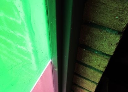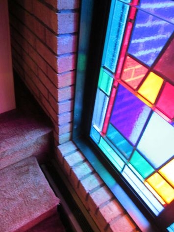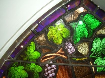 Close-up showing the broken glass on the border of this "Knocking at the Door" window