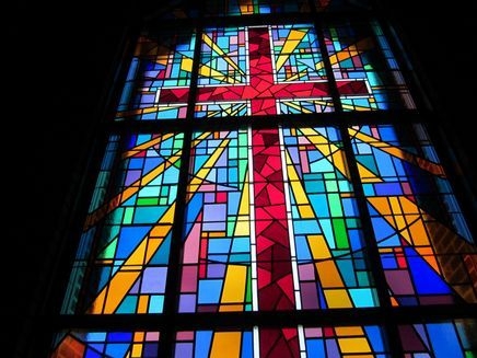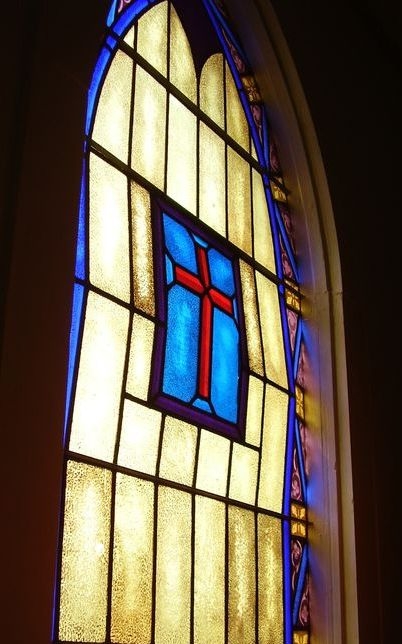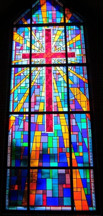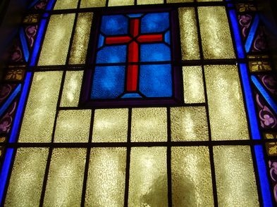 Cathedral glass window with a red cross set into a dark bronze aluminum frame