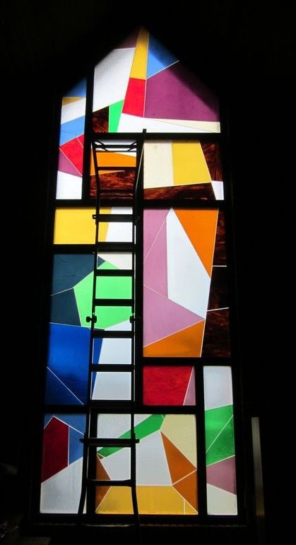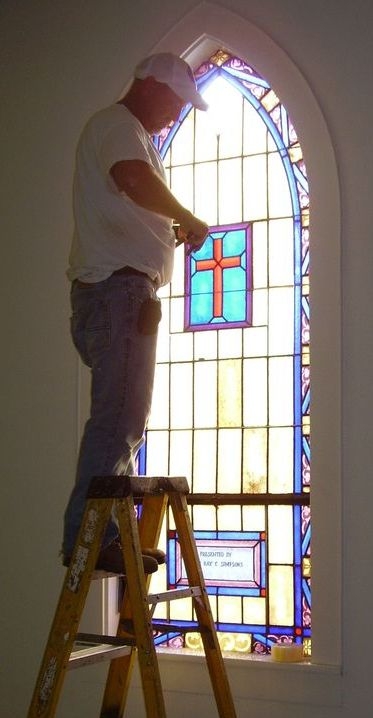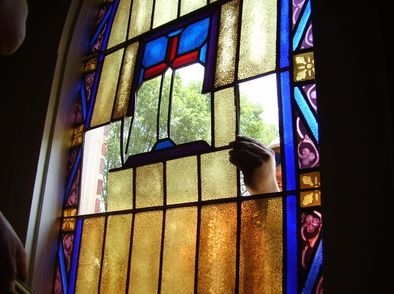 Bulge to be repaired in an existing hand-stained glass window in the chapel