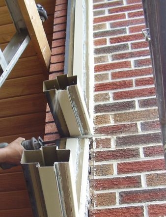 Close-up showing the installation of the cathedral glass window into the new dark bronze aluminum frame