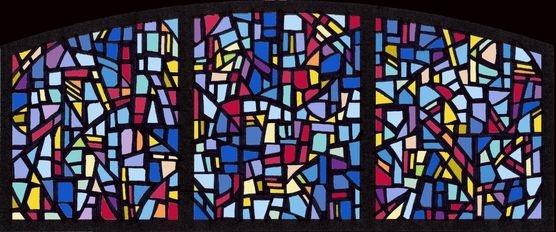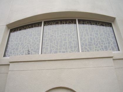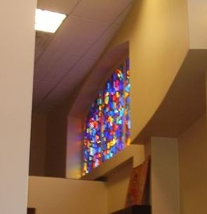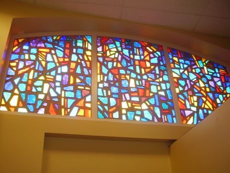 In 2009, Laws Stained Glass Studios installed (8) faceted glass windows at St. Katherine Greek Orthodox Church in Falls Church, VA. The curved-top windows (size 144" wide x 60" high) have an abstract design to match the other windows in the sanctuary. The windows were installed into the existing aluminum frames which have insulated glass units to the exterior.