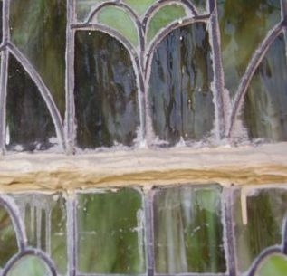 Cementing is the process of waterproofing and sealing a leaded glass window with a putty mixture. The putty is worked in between the lead came and the glass. Re-cementing is the process of applying the cementing mixture to the outside of an old leaded window usually while it is in place. Re-cementing many times is unnecessary and can cause undesired effects. Click here to learn more.