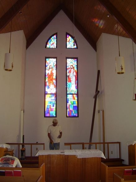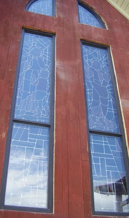 In 2013, Laws made the hand-stained glass windows and aluminum frames. The church had a local contractor to prepare the rough openings. Laws installed the dark bronze aluminum frames into the openings and placed 1/4" Lucite acrylic on the outside as the protective covering.