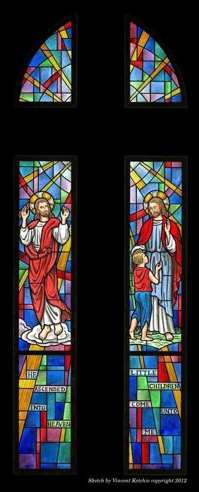 Later in 2012, Laws' artist Vincent Ketchie made a color sketch for them along with a drawing of the sizes for the openings. The window group consisted of four different windows. In the two bottom windows, there were hand-stained pictorial floating figures of Christ, one depicted him "Ascending" and the other of him "Blessing the Little Children." The church liked the design and proceeded with the project.