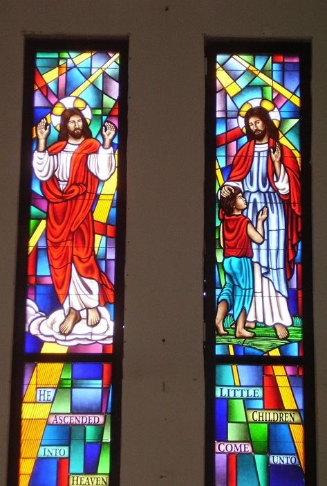 The new hand-stained glass windows with floating figures of Christ - on the left "Christ Ascending" and on the right "Jesus Blessing the Little Children"