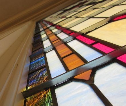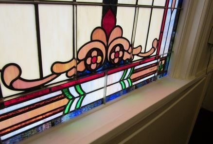 Opalescent glass window set into the existing wood frames with 1/4" Lucite acrylic on the outside as the protective covering